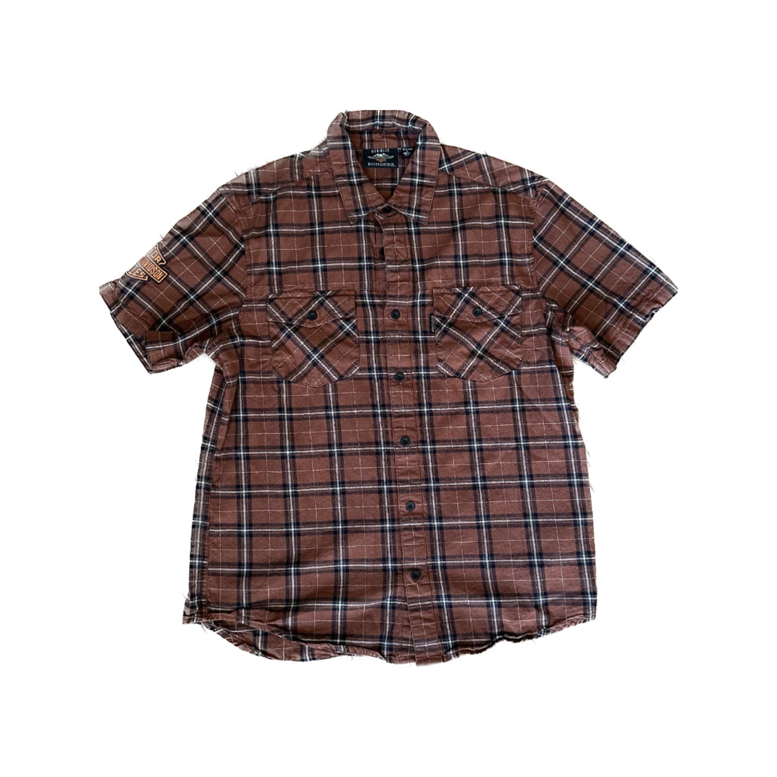 Expertly crafted by HARLEY DAVIDSON, this Pre-Owned Plaid Button Down Shirt in size L is a must-have for any motorcycle enthusiast. Made with top-quality materials, this shirt offers a comfortable and stylish fit, perfect for any ride or casual outing. A must-have addition to any wardrobe, with a subtle nod to your love for Harley Davidson.